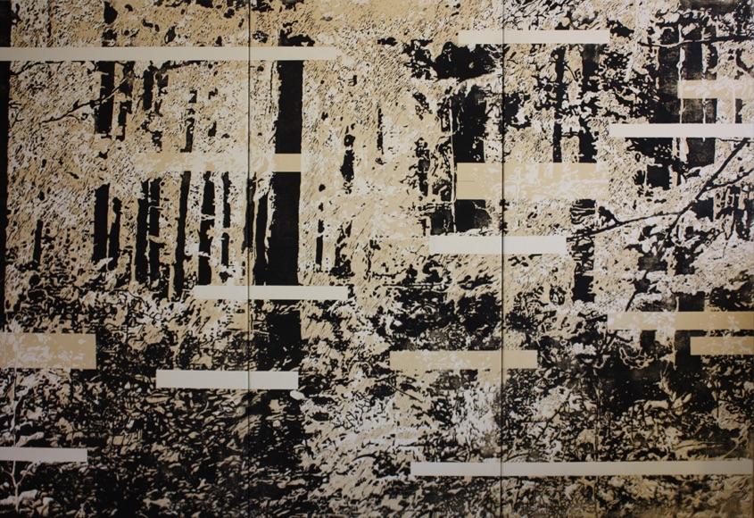Waldstück 2012/13, Linolschnitt auf Leinwand, 5 Farb- und Formvarianten (3-tlg.), 145 x 210 cm